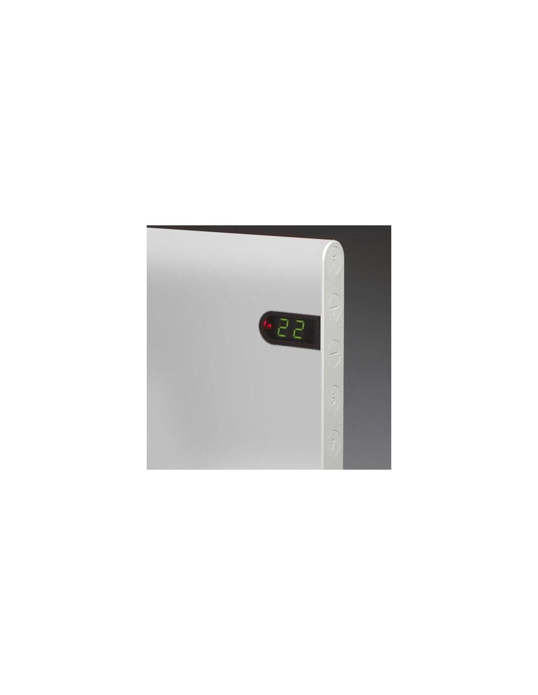 A beépített digitális termosztát folyamatosan szondázza a fűtendő helyiség hőmérsékletét és garantálja a program hatékony működését. Tetszőlegesen beállíthatunk két hőmérsékletet (komfort és takarék), ezeket a nap különböző szakaszaiban váltogathatjuk, ezzel akár 25% energiát megtakaríthatunk. Ha több helyiséget szeretnénk fűteni, akkor sem kell központi rendszerben gondolkodni, mindenhol az optimális hőmérsékletet tudjuk garantálni, egymástól függetlenül. A kezelőgombok a panel oldalán, rejtve helyezkednek el . Ezekkel tudjuk beállítani a komfort és takarék-hőmérsékletet, az időt, a napokat. A panel felületén digitális LCD kijelző kapott helyet, melynek segítségével egyszerűen programozhatóvá válik a termosztát.