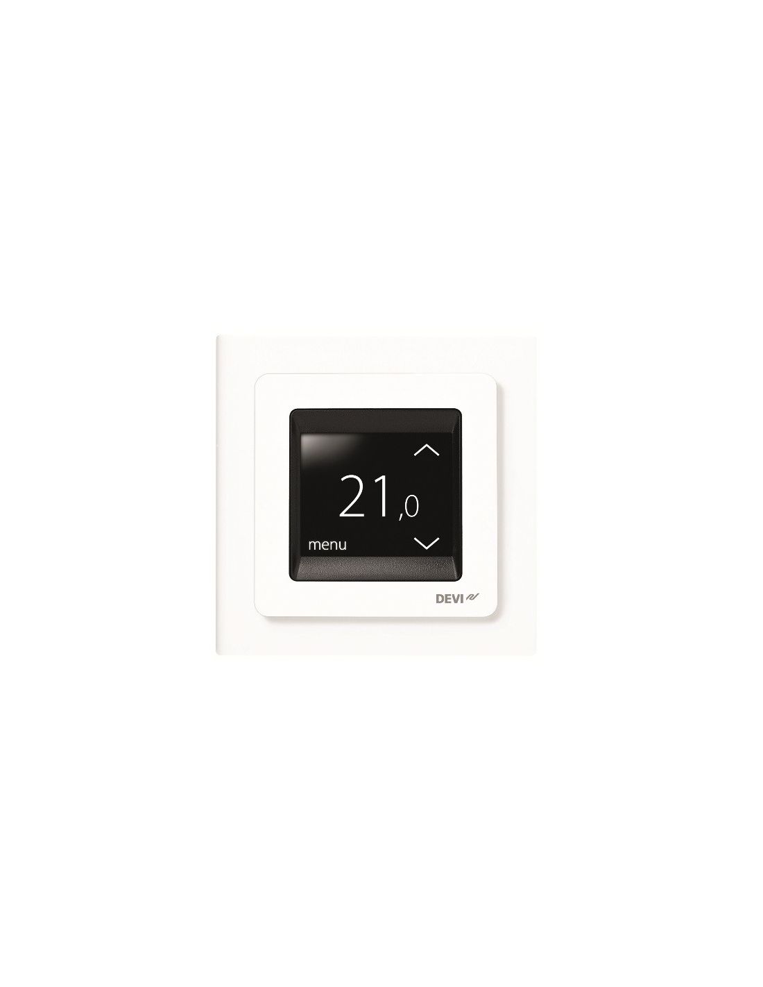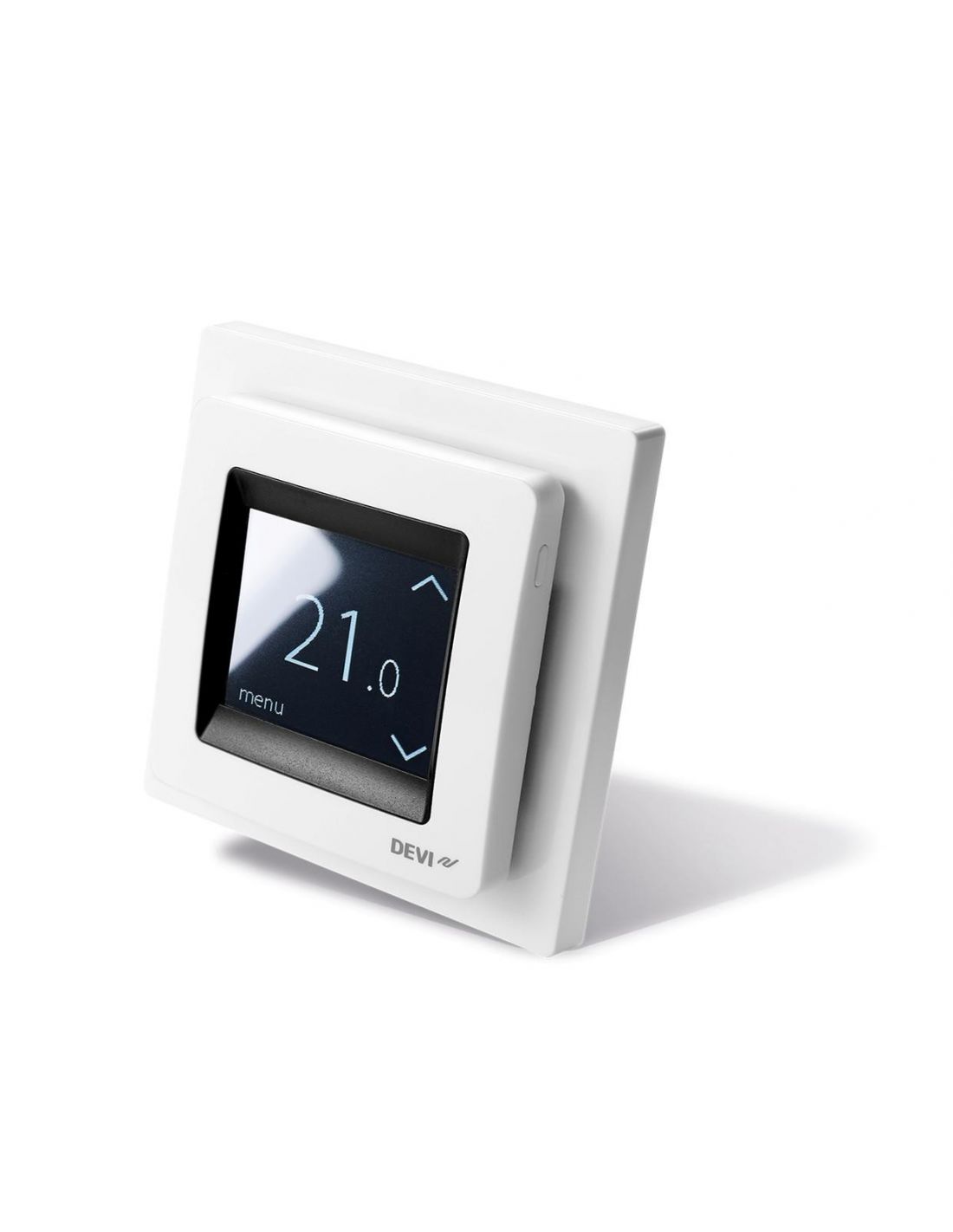 DEVIreg Touch intelligens programozható termosztát elektromos padlófűtési rendszer szabályozásához. Intelligens időprogrammal és tanulási funkcióval a maximális komfort és minimális energiafelhasználás elérésének érdekében. A termosztát kóddal is beállítható, valamint más gyártók érzékelőivel is kompatibilis.