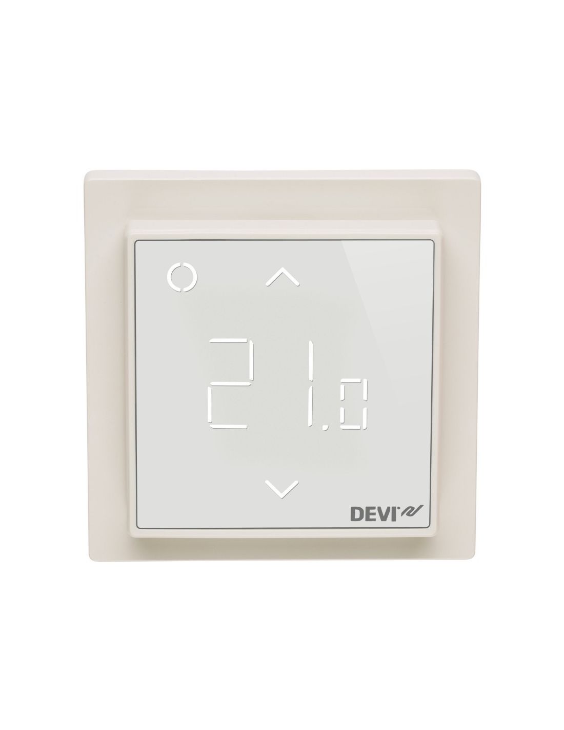 DEVIreg™ Smart érintőképernyős programozható termosztát fehér színben, elektromos padlófűtési rendszer szabályozásához, Wi-Fi kapcsolattal.